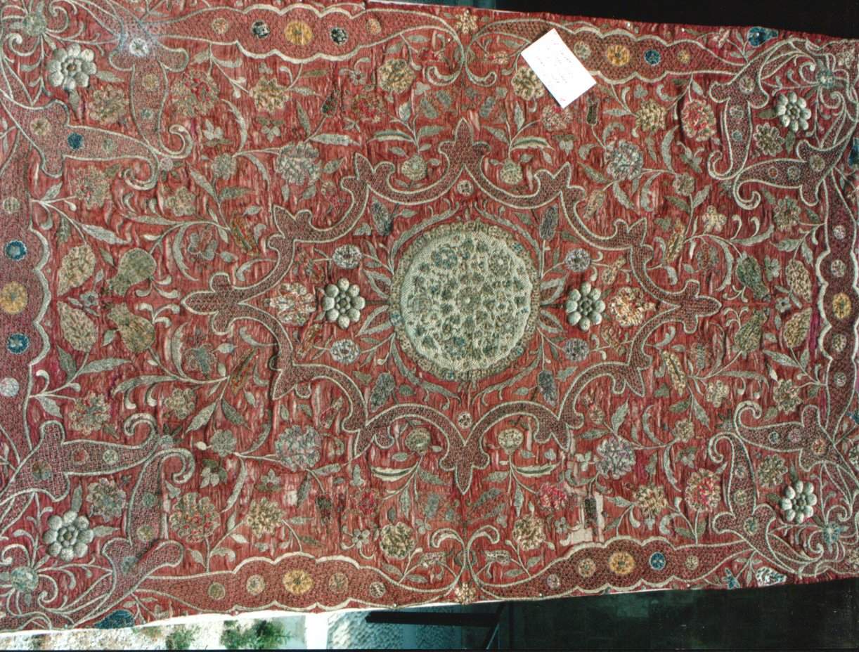 GENUINE ORIGINAL 17TH CENTURY ORIGINAL AUTNETIC HAND EMBROIDERED TEXTILE WITH PLATED GOLD AND SILVER THREADS AND WITH VERY FINE FLORAL ARTISTIC MINIATURE DESIGNS IN VELVET COLOUR. SUCH A LUXERY TEXTILE USED TO BE ORDERED BY RICH MOSLEM RELGIOUS FAMILIES AND MERCHANDS AS A GIFT TO THE HOUSE OG GOD IN MEKKA AND MEDINA IN SAUDI ARABIA TO DECORATE THE BLACK HOLLY KAABA WALLS FROM THE EXTERIOR DURING THEIR MARCHING JOURNEY EXPEDITION TO SPEND THEIR ISLAMIC AND RELIGIOUS DUTTIES PILGRIMAGE ONCE IN A LIFE TIME.CALLED AS AL HAJJ VISIT AS MENTIONED IN THE HOLLY KORAN ONCE IN A LIFE TIME. THIS TEXTILE IS KNOWN AS AL MAKHMAL TEXTILE AND USED TO BE TAKEN BY THE RELIGIOUS EXPEDITION LEADER TO MEKKA AS SIGN OF THE SYRIAN PILGRIMAGE VISITORS AND RETURNED BACK DURING 60 DAYS JOURNEY RIDING CAMELS WITH ALL THEIR FOOD SUPLIIES. THIS IS A UNIQUE PIECE WITH LITLE DAMAGES. THIS TEXTILE WAS BOUGHT IN DAMASCUS BY MY FATHER IN 1945 AND BROUGHT BACK TO ISFAHAN TO ADD IT TO HIS COLLECTION. |